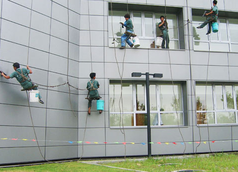 1、外墻清洗的方式現階段外墻清洗具體有這兩種方式:吊板方式和吊籃擦窗方式。吊板方式是用吊繩、吊板將人吊到工作方位開展清理。這樣的方式非常簡單,成本也低,只需職工身體狀況好、繩索對接堅固就可以開展,通常的大廈都能夠用這樣的方式開展清理,可是這樣的方式的操作必須使安全防范措施合格,要不然危害性非常大,造成安全事故的基本都是因安全防范措施不合格造成的。